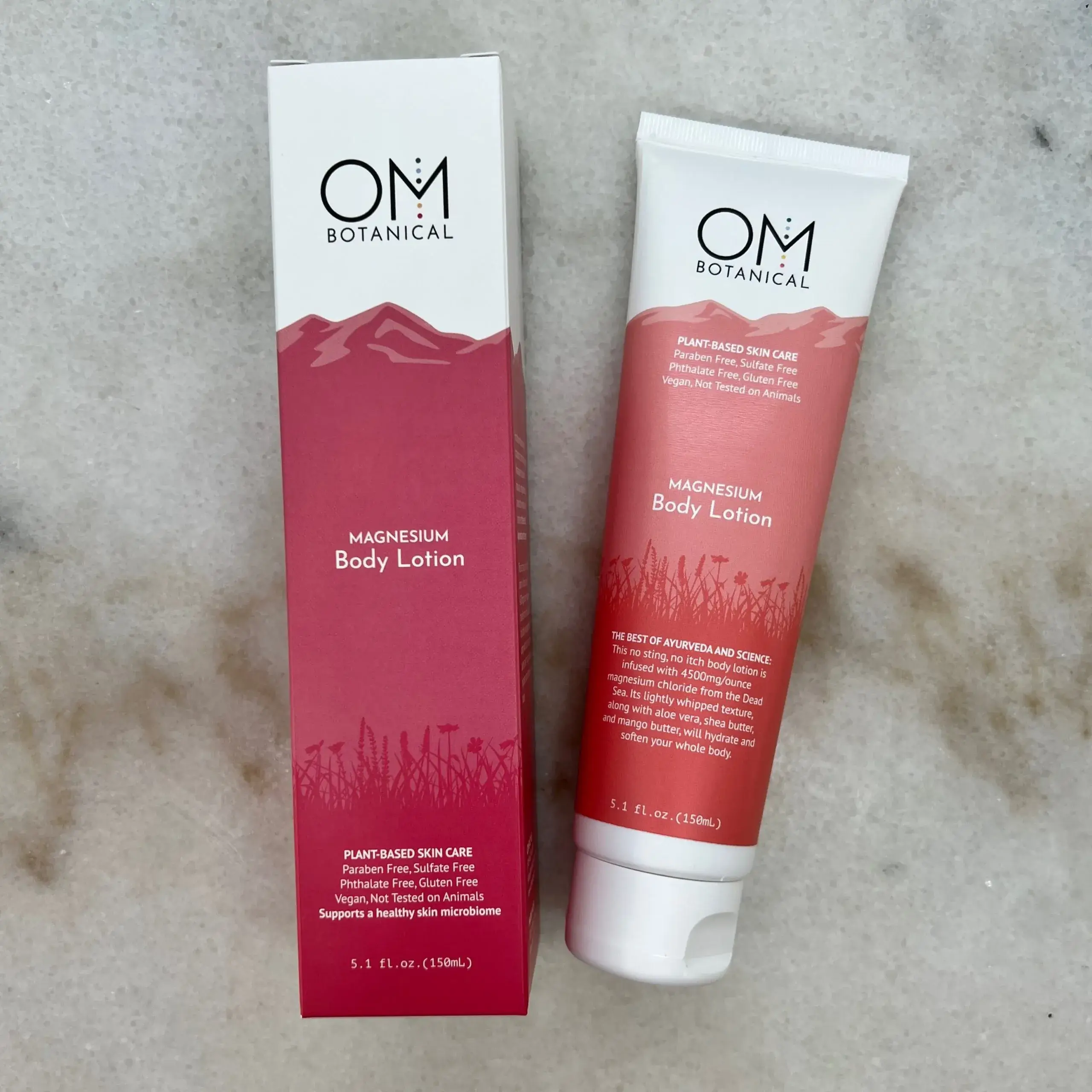 Our no sting, no itch magnesium body lotion is infused with 4500mg/oz topical Magnesium supplement, Aloe Vera and Mango Butter. Formulated to relax muscles, calm nerves, and sleep better, it also helps to relieve muscle cramps, Restless Leg Syndrome (RLS), and migraines. OM Botanical’s luxurious body and foot cream is 100% natural and organic. Now in a newly improved 6 oz. easy-to-use dispenser.