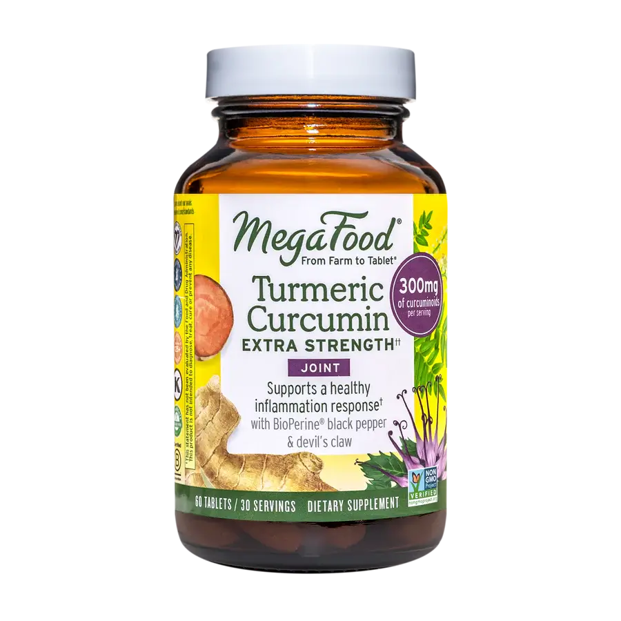 MegaFood Turmeric Strength for Joint combines a powerful array of healthful compounds‚ whole foods and extracts that provide support for joint inflammation resulting from occasional overexertion or vigorous exercise‚ and features real‚ farm-fresh turmeric root together with turmeric extract to deliver 300 mg of curcumin per serving. MegaFood also added BioPerine‚ a patented black pepper extract that helps support the absorption of curcumin‚ 200 mg of ginger root‚ and the herb devil’s claw‚ which has been traditionally used to provide joint comfort.•Turmeric supplement that maintains joint health and mobility•Supports a healthy response to inflammation of joints and joint tissue•Provides support for joint inflammation resulting from occasional overexertion or vigorous exercise•Contains devil’s claw‚ an herb traditionally used to provide joint comfort•Features a proprietary blend of Turmeric Root and pure turmeric extract to deliver a guaranteed minimum of 300 mg curcuminoids•Includes 200 mg of Ginger Root•BioPerine‚ a patented black pepper extract‚ is included to support the absorption of curcumins (which alone are very difficult for the body to assimilate)•Can be taken any time of the day‚ even on an empty stomach these statements have not been evaluated by the Food and Drug Administration (FDA).